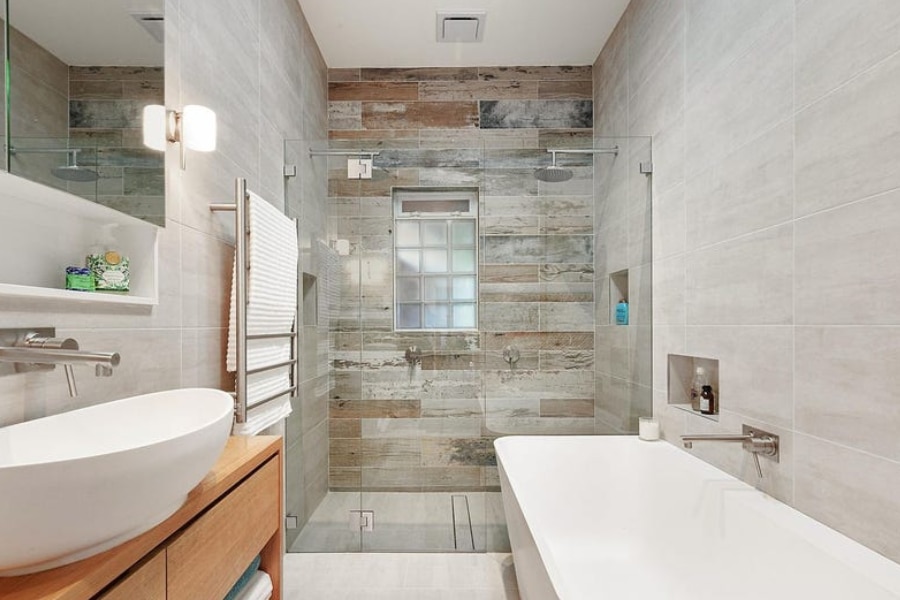 – Large renovated bathroom with freestanding bath and frameless shower
